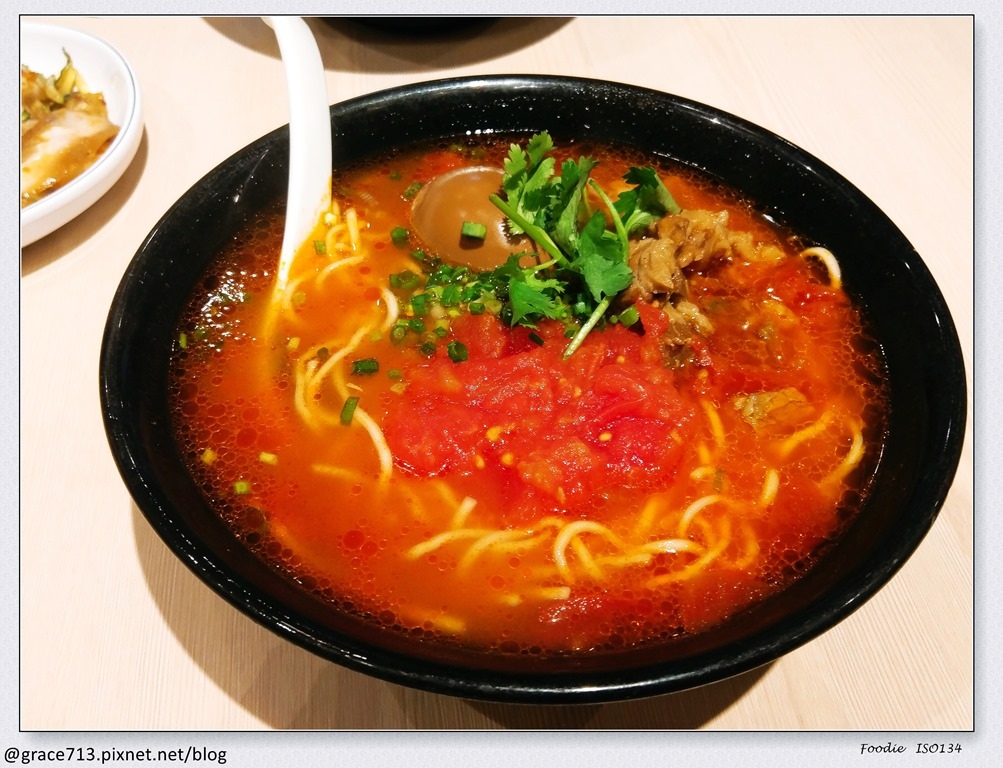 我不輸人的點了一碗也都是紅色, 但其實是蕃茄口味的牛肉麵, 他是認真使用蕃茄去煮的湯頭, 十分清爽好喝, 但牛肉有點硬, 台灣的牛肉麵的牛肉一向是超軟嫩的, 扣掉很硬的牛肉外, 還蠻好吃的