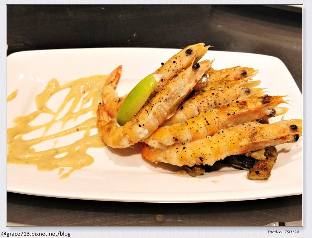 一上來, 六隻排好好的大草蝦, 朋友說, 真好不用剝殼, 這也是高級鐵板燒作法, 不是提供蝦仁, 而是有頭有尾的整隻蝦,中間剝好殼 (高級店是給明蝦),旁邊的醬是芥茉,但我沒完全沒沾, 因為只要加點檸檬就夠提味了,