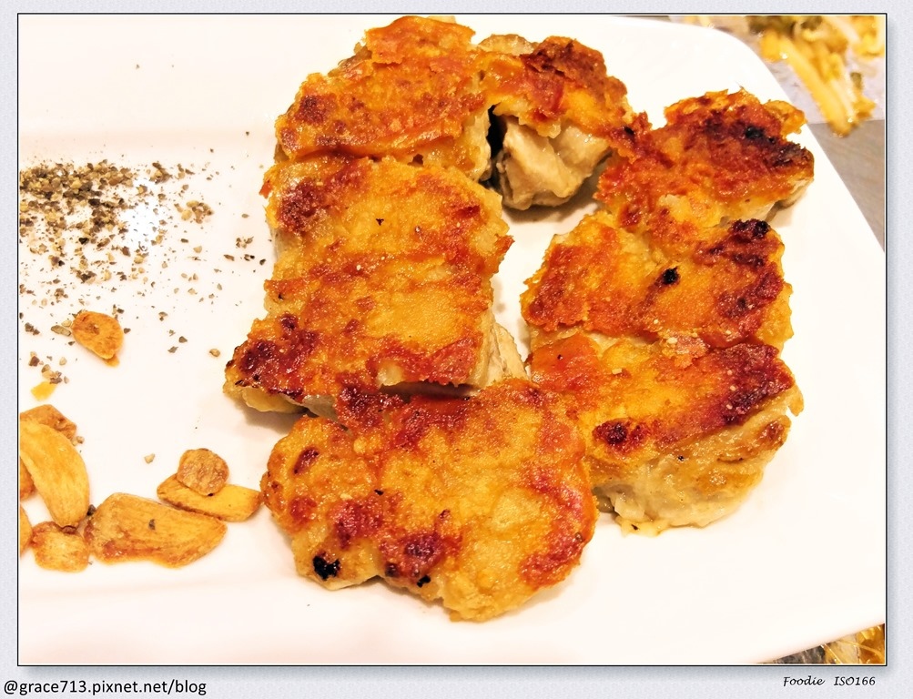 雞腿排, 光用看的就知道酥脆度夠, 其實吃的下的話, 我很愛去鐵板燒點雞腿排, 因為師傅會把雞腿排皮的那面煎的很像炸的一樣酥脆, 這裡一樣把鹽, 胡椒及蒜片放在旁邊, 由客人自己依口味使用, 他在煎時, 我有看到他有灑一點鹽, 但實際吃起來味道偏淡, 所以不沾的話會沒味道, 之前我家附近有間大埔 (關掉了) , 他的雞排都不是大廚煎的, 很常送上來都己經煎過變有些焦了, 這裡是酥脆剛好, 又沒焦, 腿肉部份又很嫩,