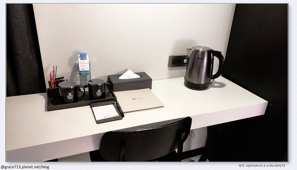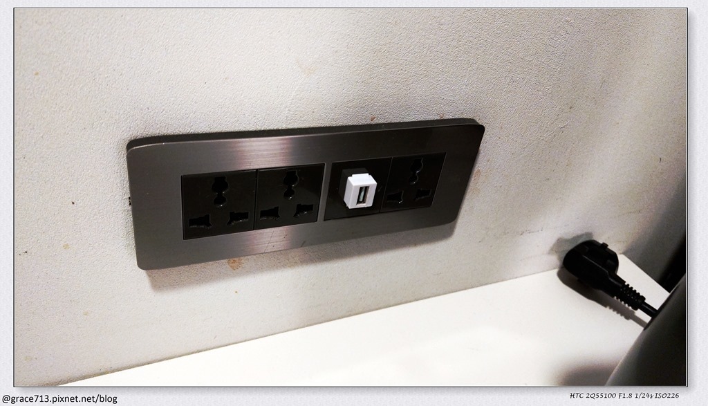 雖然韓國是雙圓插, 但這飯店的插頭有提供通用的, 所以沒帶轉接頭也沒問題 , 還有USB插頭, 冰箱在桌下, 沒有拍到, 一間房間有兩瓶水, 一瓶常溫在桌上, 一瓶在冰箱