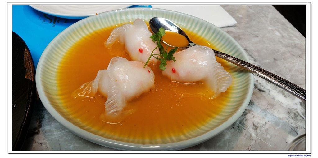 裡面的餡有蝦及魚漿等..下面的湯是南瓜濃湯, 這道好拍又好吃, 現在餐廳的菜似乎都要這樣設計才行