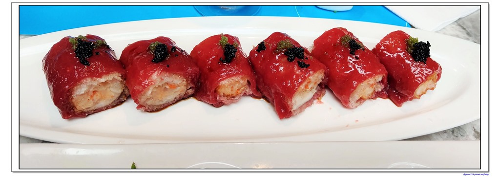 這腸粉看起來跟握壽司一樣, 它是把腸粉皮包有龍蝦肉餡及油條一起, 也是我很愛的一道