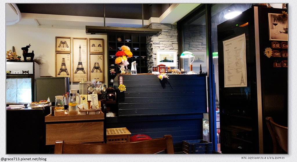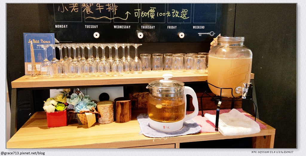 老闆娘很親切的替我們倒了水, 告知除了這有含水果的水外, 另有甘菊茶及綠豆水都是可以自行取用, 一般法式餐廳, 可是連水都要收水資了, 這裡居然是喝到飽, 真是很佛心的店家啊