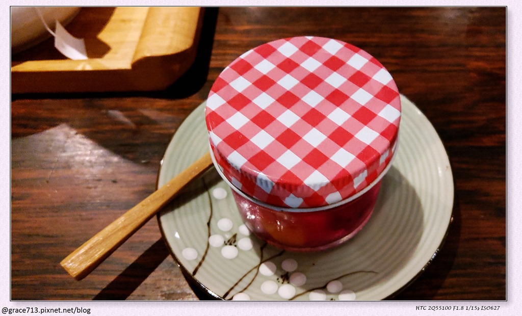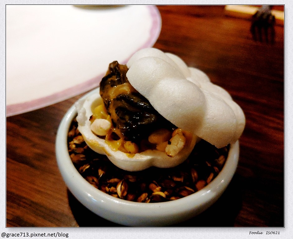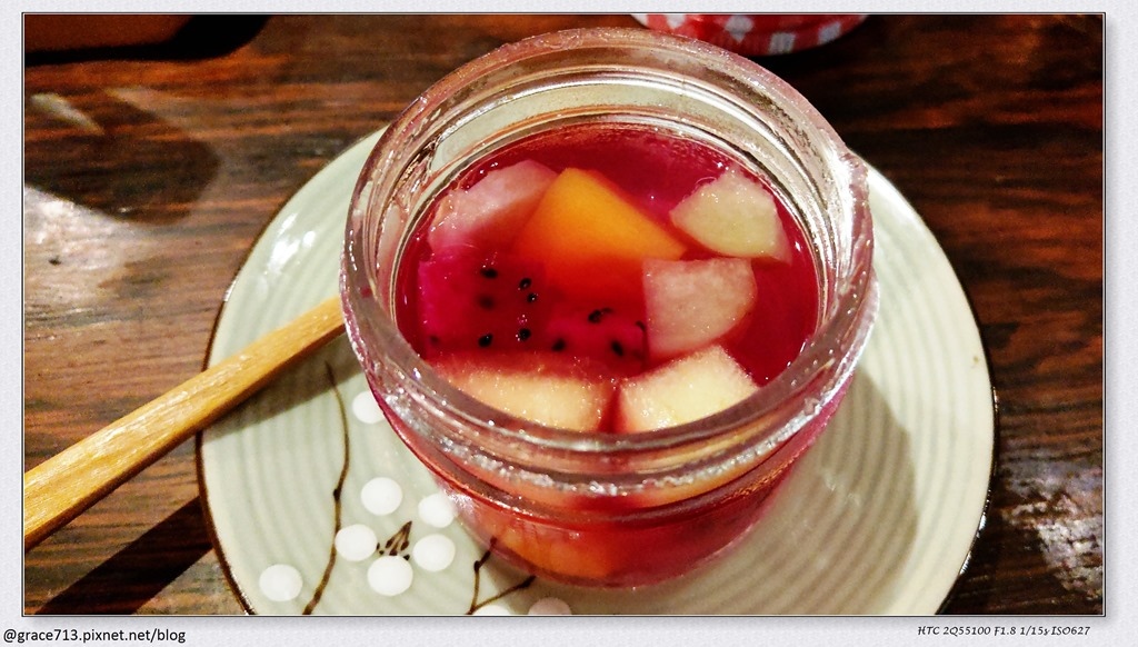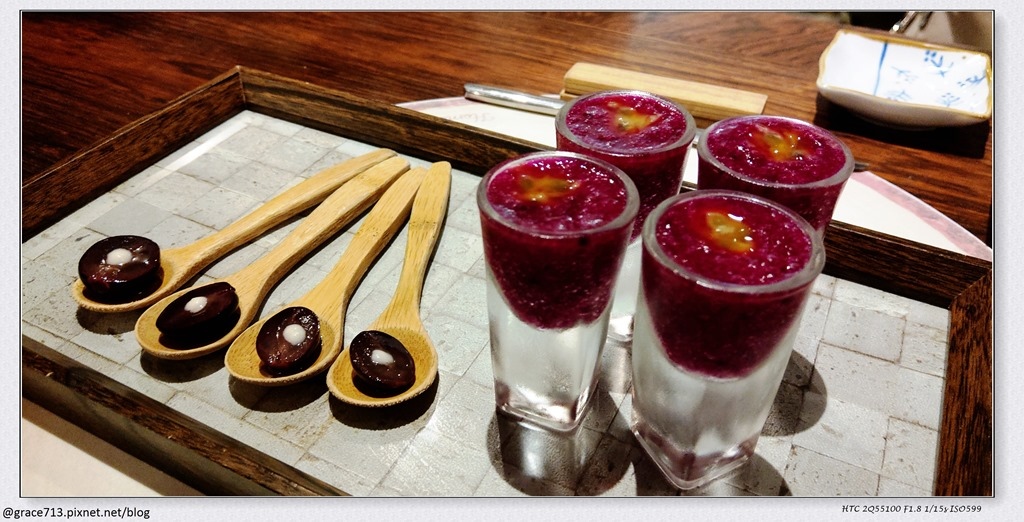 人都到齊後, 先上了迎賓小點, 有火龍果作的像飲品感覺的餐點及一個應是酒釀葡萄的小點心 (老板娘都有解說, 是我沒在聽)