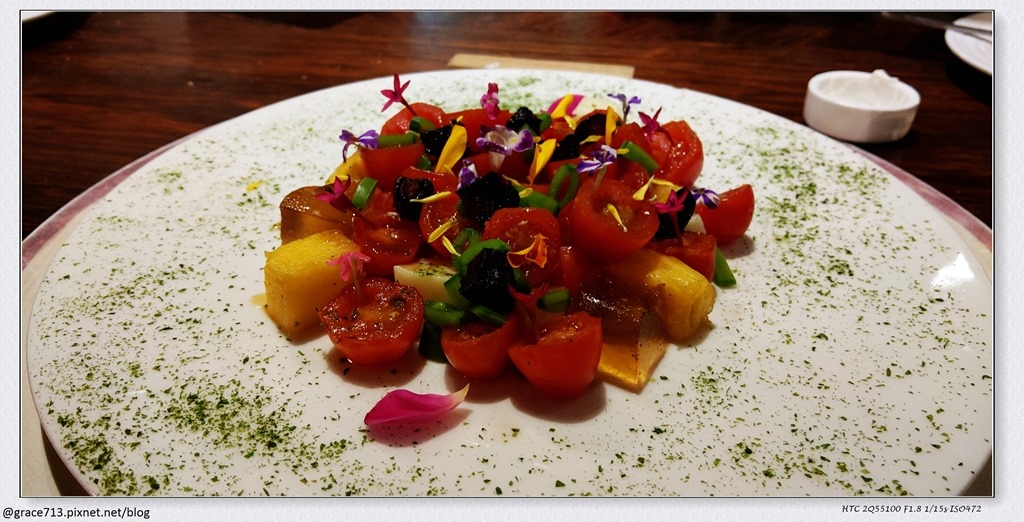 第一道冷前菜 是小蕃茄/果乾 /起司/自製果凍 ,