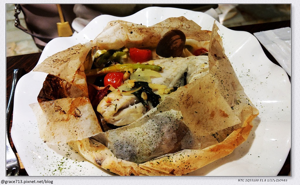 烘烤紙包魚+海鮮 , 這一剪開白酒的香味就出來了, 很香, 我有試吃魚肉, 感覺也不錯
