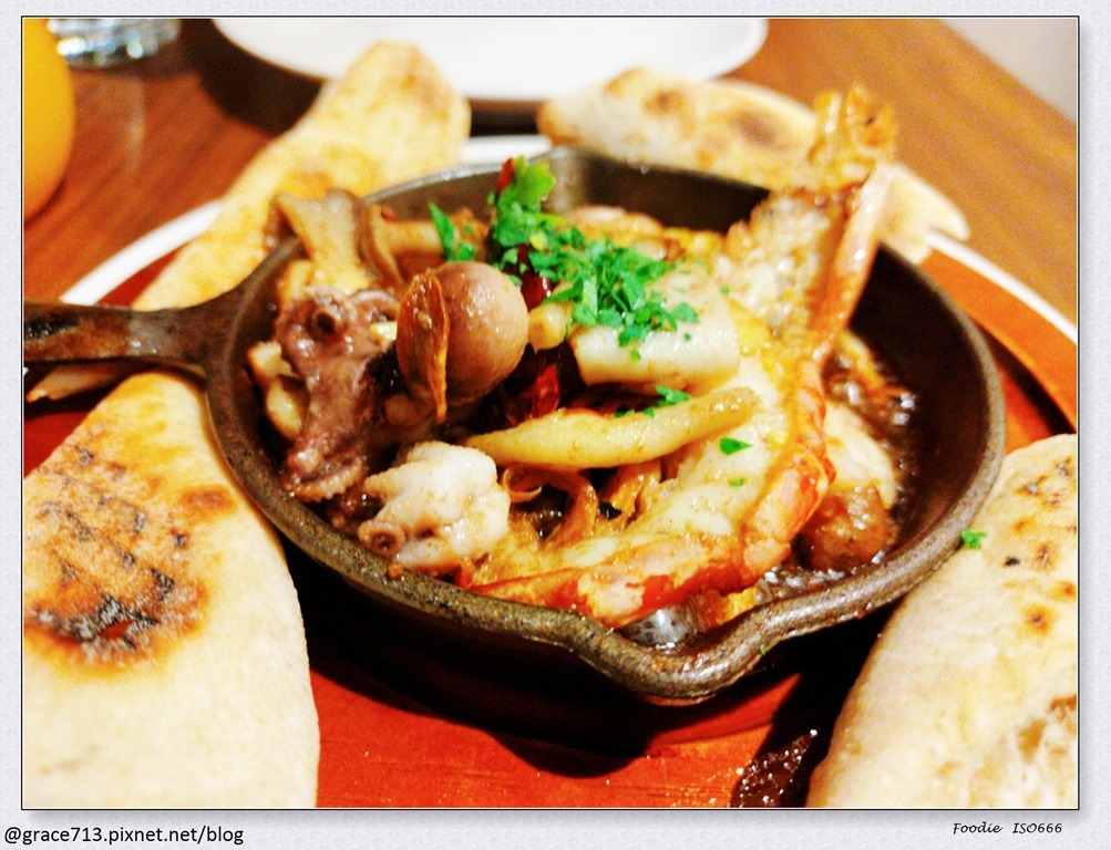 之前對於他們的 Ajillo 系列很喜歡, 這次一樣點了蒜味海鮮油封, 一上來香味四溢, 用附的佛卡夏去沾蒜味橄欖油, 真的好好吃, 我自己在家也試作過, 但味道不足..還是餐廳作的好吃啦