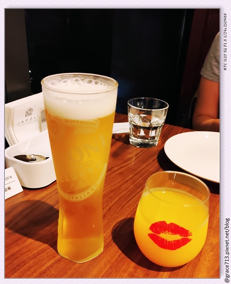 餐廳有打卡送飲料的活動, 朋友打了卡送了一杯柳橙汁, 杯子有紅唇圖案很可愛, 而我想試義大利啤酒, 所以選了啤酒囉 (未成年請勿飲酒)