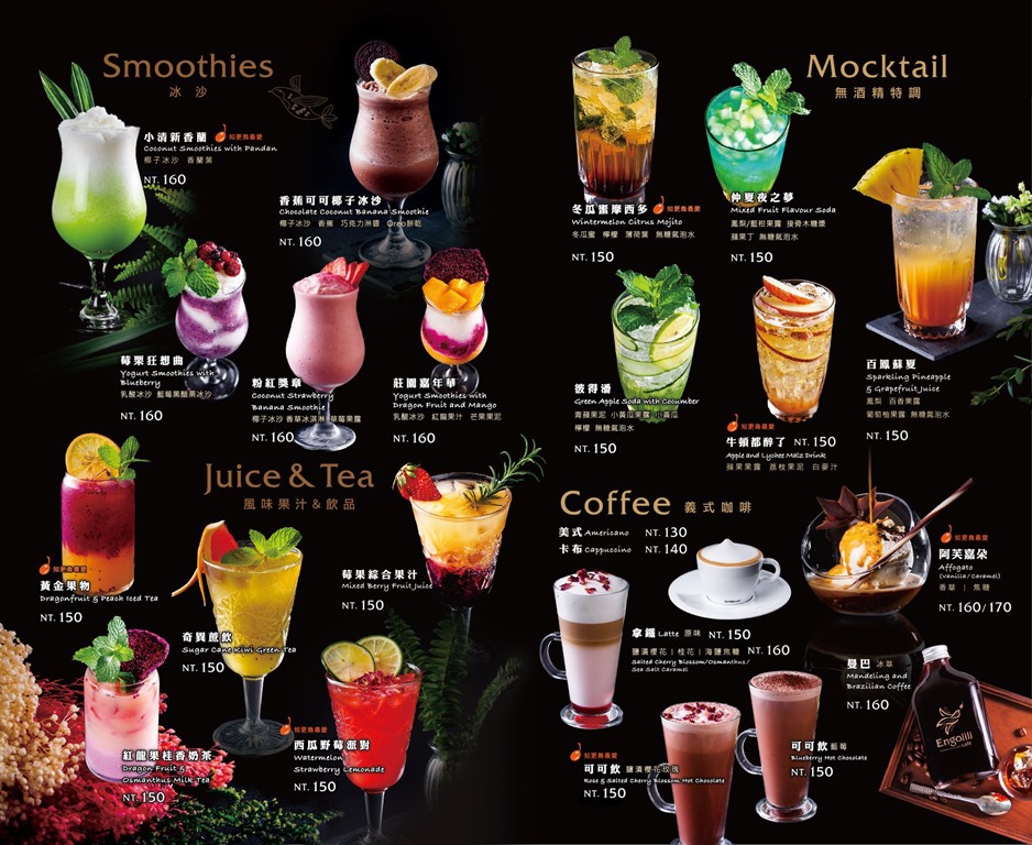 菜單(我沒拍照)有分成甜點, 英式早午餐, 等..每個看起來都好好吃哦 (菜單見文末), 飲料也看起來很繽紛, 感覺這裡比較擅長水果類飲料, 咖啡類選項比較少