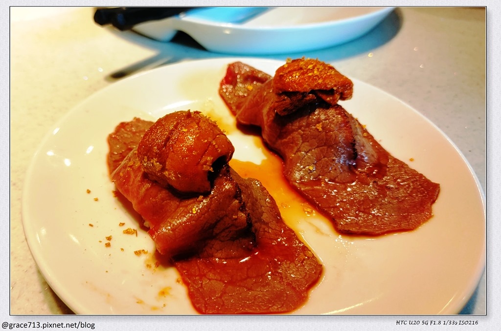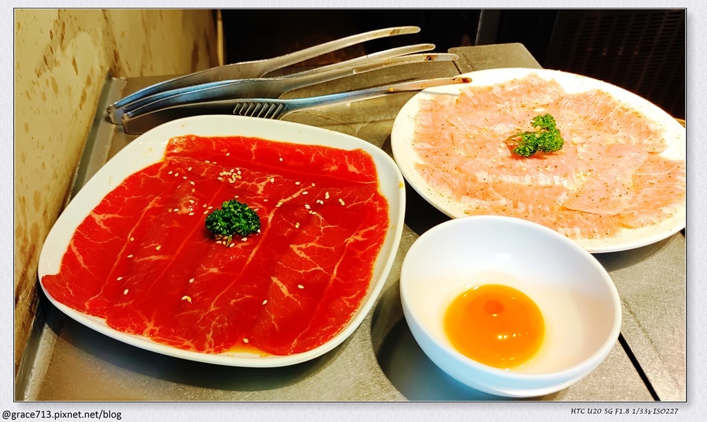 肉有用醬醃過 烤好後沾生蛋黃吃, 有點像吃高級壽喜燒的感覺, 還蠻特別的