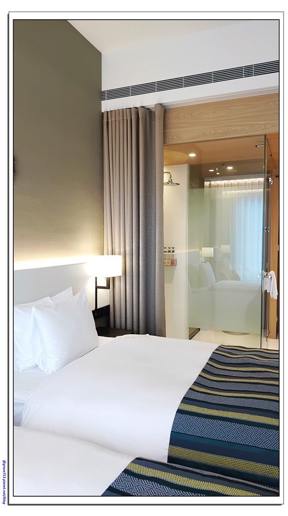 淋浴間雖是透明的, 但有窗簾隔開用水區及客房區, 地板也是分成地毯及地板,