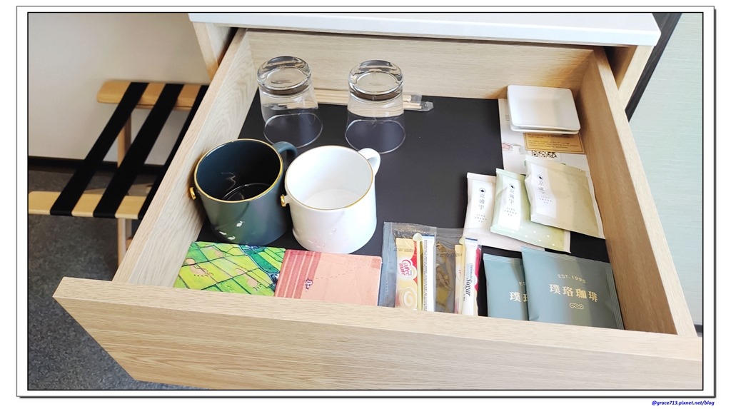 抽屜內除了有杯子外, 茶包及咖啡用的是京盛宇及璞珞, 算是微高級感