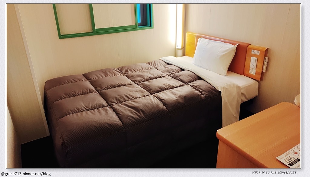 床頭有插座, 很適合愛睡前滑手機的現代人,. 不過, 因為沒有床頭桌, 我每天都把椅子搬來當床頭桌, 隔天清潔人員都又移回去