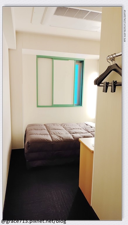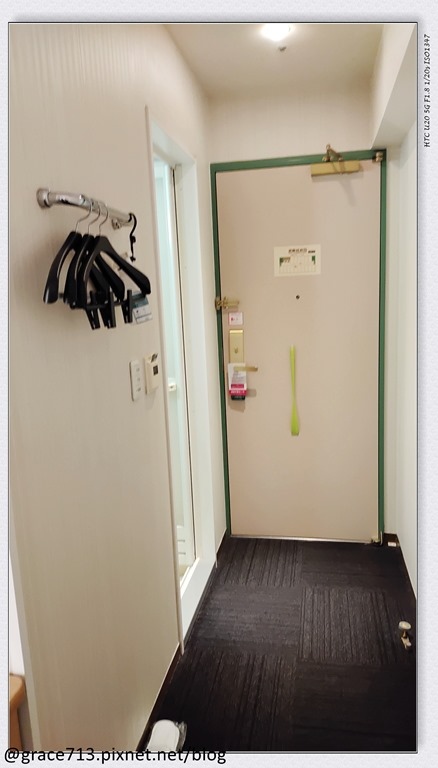 我訂的單人房 , 依官網是寫 12m2 , 一樣一進門右邊是洗手間, 衣架就是在牆上的簡單型 ,地上的空間足夠我打開一個 24”行李箱,