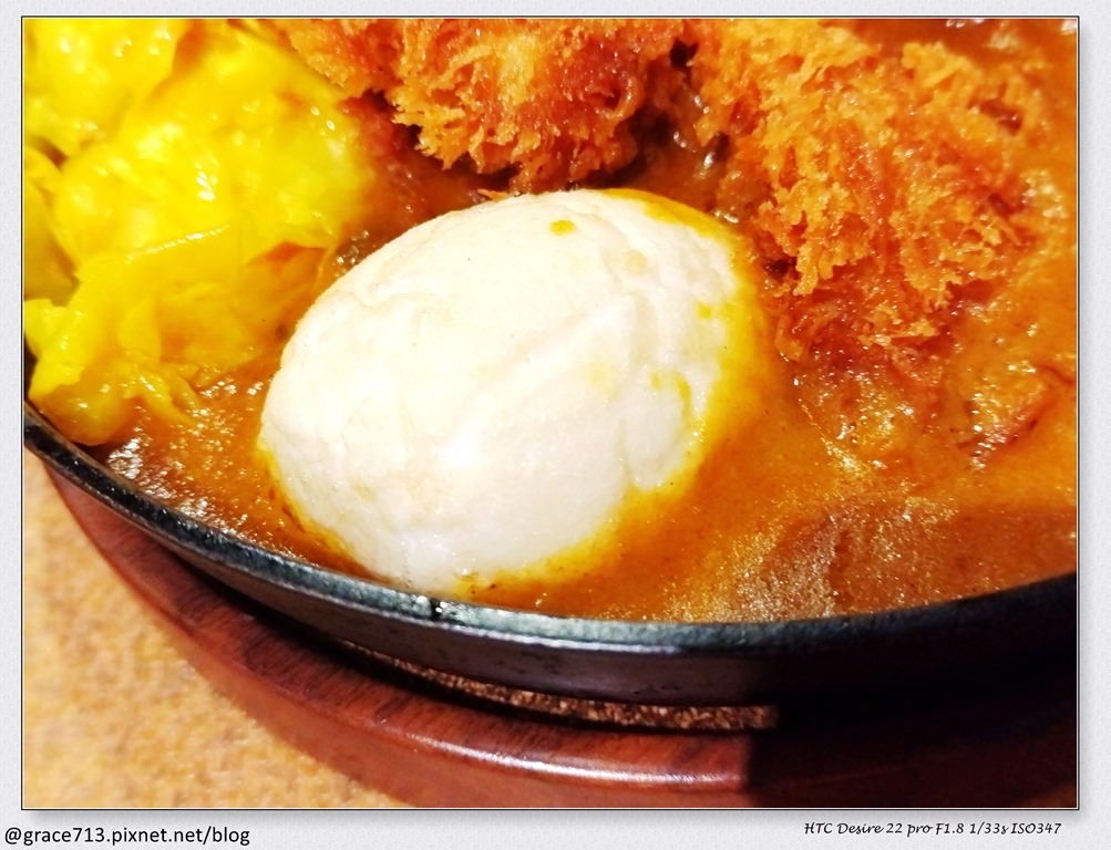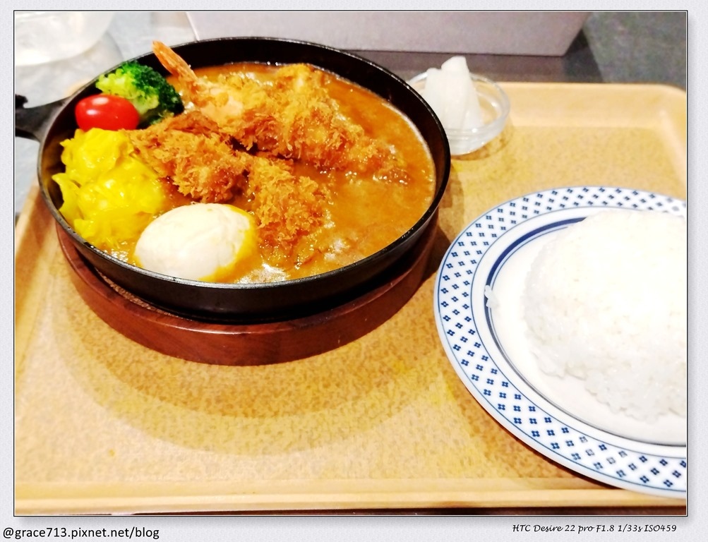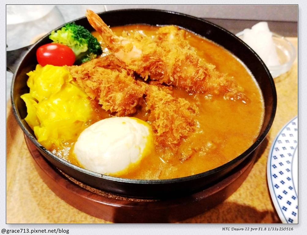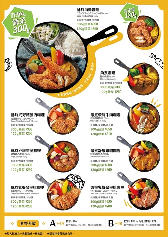 這次我點了 酥炸海鮮咖哩 120g 蔬菜版 (NT350), 飯減半加一個炸蛋(+NT29), 綜合醬